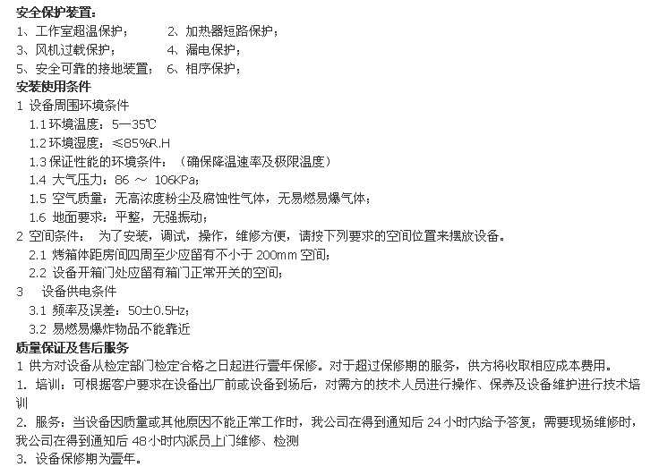 電器部分:電源380V或220V,配控制電箱于烤箱頂側(cè)部/側(cè)面,采用微電腦智能型LED數(shù)顯溫控器,采用模塊連續(xù)緩沖式輸出控制加熱器, 采用SSR固態(tài)繼電器或SCR電力調(diào)整器輸出加熱(當溫度到達設(shè)定溫度值時,此時烤箱處于恒溫狀態(tài),自動調(diào)整輸出功率,從而降低整個烤箱的功率,達到省電效果), PID數(shù)字設(shè)置、自動恒溫、自動計時(配有自動計時器可調(diào)999min數(shù)字設(shè)定,溫度到后定時報警斷電、超溫斷電、漏電保護斷路器、電機過載保護等功能,定時和超溫報警器及信號指示燈分別控制和顯示,空載內(nèi)部溫差±2度??刂齐娤渖涎b有多色工作指示燈,可顯示烤箱的工作情況和故障。